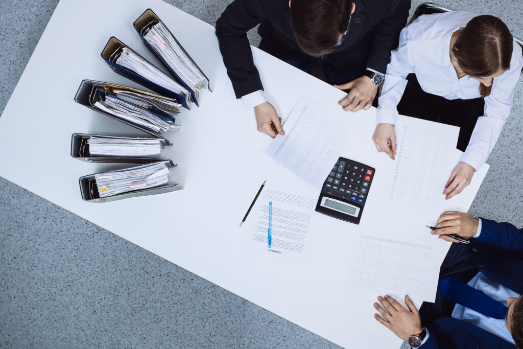 Business people at meeting, view from above. Bookkeeper or financial inspector making report, calculating or checking balance. Internal Revenue Service checking financial document. Audit and tax concept.